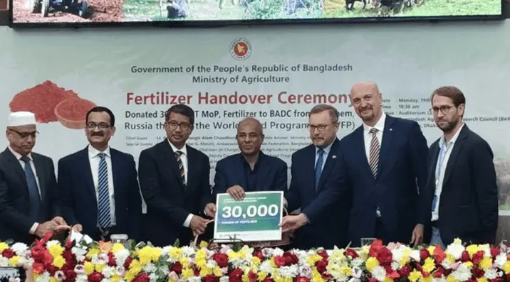 বাংলাদেশকে ৩০ হাজার টন পটাশ সার উপহার দিয়েছে রাশিয়া ফেডারেশন। বিশ্ব খাদ্য কর্মসূচি (WFP)-এর মাধ্যমে এই সার বাংলাদেশ সরকারের কাছে হস্তান্তর করা হয়। সোমবার (১৯ জানুয়ারি) আনুষ্ঠানিকভাবে এই উপহার গ্রহণ করে বাংলাদেশ।